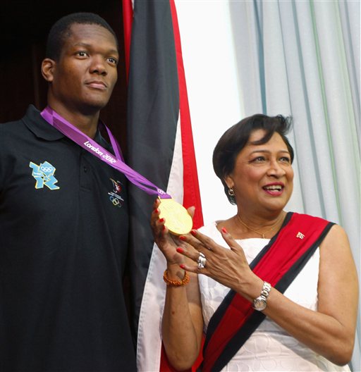 Η πρωθυπουργός του Τρίνινταν&Τομπάγκο καμαρώνει με το ανέλπιστο χρυσό μετάλλιο του πιτσιρικά Ουόλκοτ στον ακοντισμό.