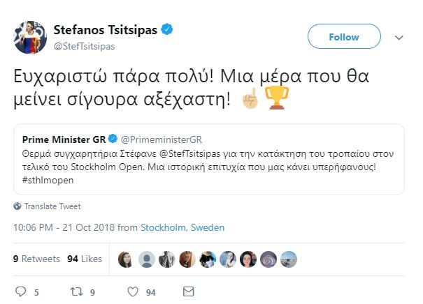 Απάντηση στο συγχαρητήριο μήνυμα του Πρωθυπουργού Αλέξη Τσίπρα έδωσε ο κορυφαίος Έλληνας τενίστας Στέφανος Τσιτσιπάς μέσω του προσωπικού του λογαριασμού στο twitter.