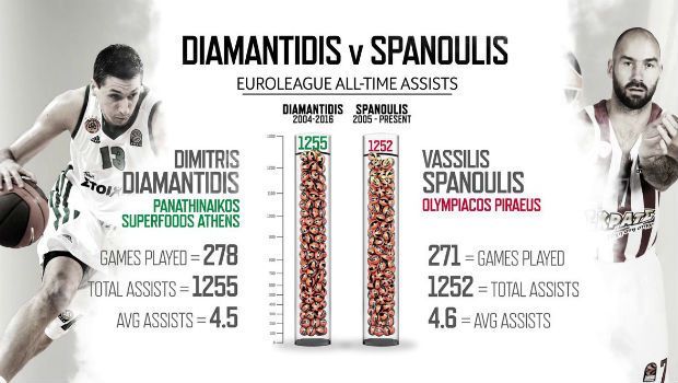 Ο Δημήτρης Διαμμαντίδης σε 278 συμμετοχές μοίρασε 1.255 ασίστ στους συμπαίκτες του με μέσο όρο 4,5 ανά παιχνίδι, ενώ προς το παρόν ο Βασίλης Σπανούλης σε 271 αναμετρήσεις έχει 1.252 ασίστ (μ.ο. 4,6).
