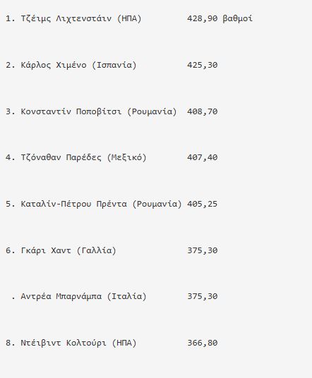 Το βάθρο συμπλήρωσε ο Ρουμάνος Κονσταντίν Ποποβίτσι με 408,70 βαθμούς.