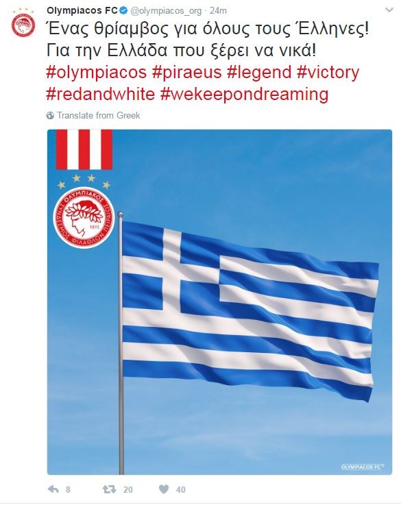 Μία ελληνική σημαία ανήρτησε στον λογαριασμό του στο Twitter ο Ολυμπιακός λίγα λεπτά μετά το θρίαμβο επί της Οσμάνλισπορ με 3-0 μέσα στην Άγκυρα.«Ένας θρίαμβος για όλους τους Έλληνες. Για την Ελλάδα που ξέρει να νικά», ανέφερε χαρακτηριστικά η λεζάντα που συνόδευε τη φωτογραφία που ανήρτησαν οι «ερυθρόλευκοι» μετά την πρόκριση στους «16» του Europa League.Δείτε την ανάρτηση του Ολυμπιακού: