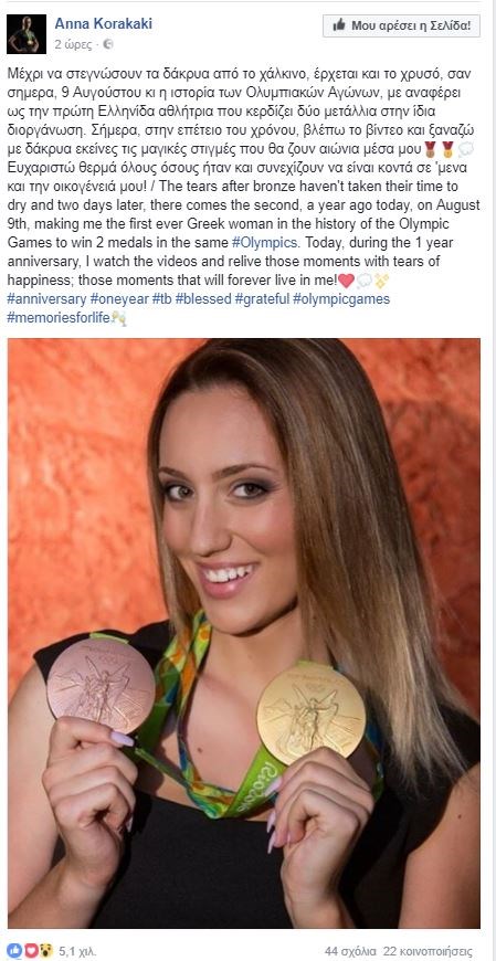 Την επέτειο του θριάμβου της στους Ολυμπιακούς Αγώνες του Ρίο στις 9 Αυγούστου του 2016 γιόρτασε με ανάρτησή της στο προφίλ της στο Facebook η χρυσή Ολυμπιονίκης, Άννα Κορακάκη.