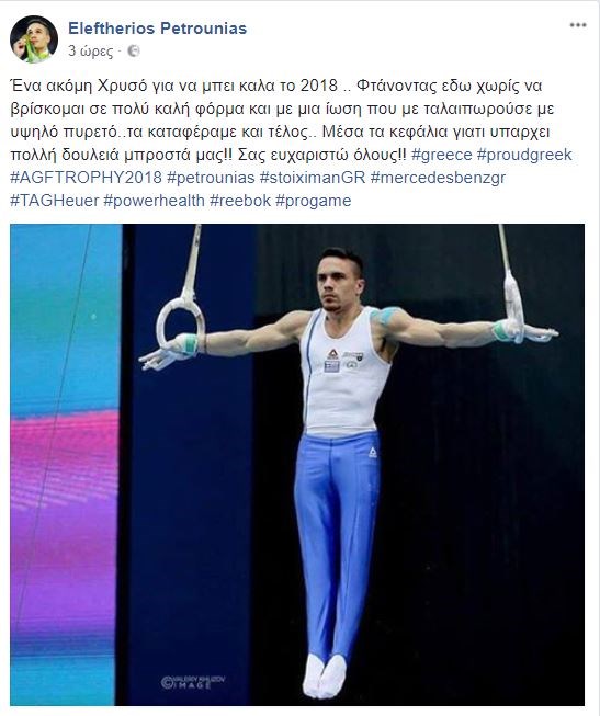 “Ένα ακόμη Χρυσό για να μπει καλά το 2018 .. Φτάνοντας εδώ χωρίς να βρίσκομαι σε πολύ καλή φόρμα και με μια ίωση που με ταλαιπωρούσε με υψηλό πυρετό..τα καταφέραμε και τέλος.. Μέσα τα κεφάλια γιατί υπάρχει πολλή δουλειά μπροστά μας!! Σας ευχαριστώ όλους!!”, έγραψε ο ίδιος στον λογαριασμό του στο Facebook.