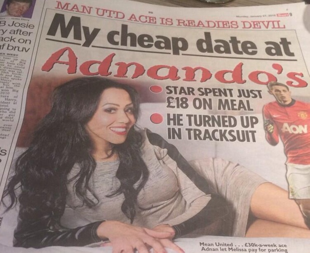 «Γνωριστήκαμε μέσω σελίδας κοινωνικής δικτύωσης και κλείσαμε ραντεβού. Εγώ έβαλα τα καλά μου, πήγα ακόμη και σε επαγγελματία μακιγιέρ δίνοντας 30 λίρες και περίμενα να έρθει με κάποιο ακριβό αυτοκίνητο να με πάρει. Όμως εκείνος ήρθε φορώντας μια φόρμα και καταλήξαμε να τον οδηγώ εγώ με το παλιό μου Fiesta. Όταν μου είπε πως θα με πάει στο ‘Nando’s’ απογοητεύτηκα», δήλωσε η νεαρή κοπέλα στην εφημερίδα, που έχει τίτλο «Το φτηνό μου ραντεβού. Ο σταρ της Μαν. Γιουνάιτεντ ξόδεψε μόλις 18 λίρες για φαγητό».