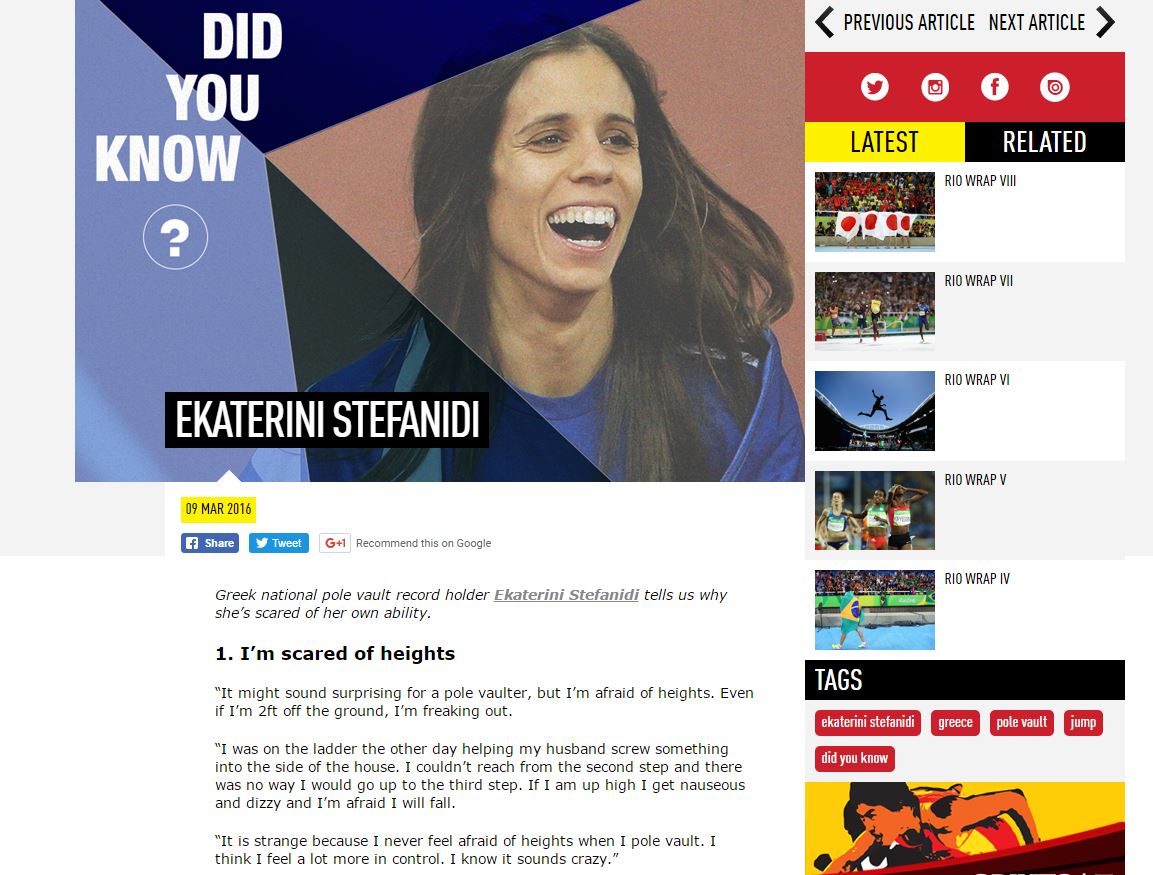 Η χρυσή Ολυμπιονίκης του Ρίο, Κατερίνα Στεφανίδη φοβάται τα ύψη και το παραδέχθηκε δημόσια σε συνέντευξή της στην ιστοσελίδα της IAAF στις 9 Μαρτίου του 2016.