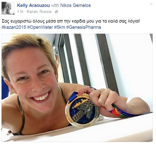 Χαμογελαστή όσο ποτέ η ελληνίδα κολυμβήτρια, Κέλυ Αραούζου, ποζάρει στο Facebook με το ασημένιο μετάλλιο που κατέκτησε στα 5 χλμ ανοιχτής θάλασσας στο Παγκόσμιο Πρωτάθλημα υγρού στίβου του Καζάν.