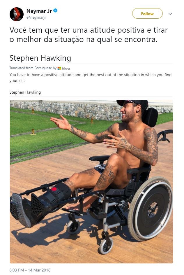 Ο ποδοσφαιριστής της Παρί Σεν Ζερμέν έγραψε στα social media: «Πρέπει να έχεις θετική στάση και να αξιοποιείς όσο καλύτερα μπορείς την κατάσταση στην οποία βρίσκεσαι», ενώ στη φωτογραφία που ανέβασε, είναι καθισμένος σε αναπηρικό αμαξίδιο.