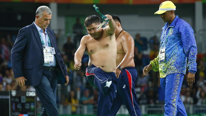 Τραγελαφικές εικόνες με… στριπτίζ και πέταγμα παπουτσιών, σημάδεψαν τον τελικό των ρεπεσάζ της κατηγορίας των 65 κιλών του Ολυμπιακού τουρνουά ελευθέρας πάλης ανδρών στο Ρίο.