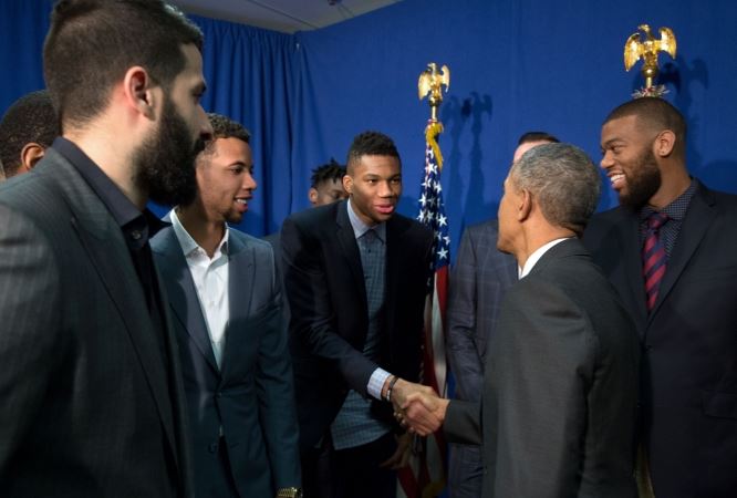 Ο πρόεδρος των ΗΠΑ συναντήθηκε σε ειδική τελετή με την ομάδα των Milwaukee Bucks. Εκεί ο Μπάρακ Ομπάμα γνώρισε από κοντά και τον Γιάννη Αντετοκούνμπο ενώ έβγαλε φωτογραφία δείχνοντας την τεράστια διαφορά που έχει η δίκη του παλάμη από αυτή του Έλληνα σταρ των «ελαφιών».