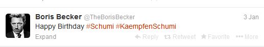 Ο Γερμανός πρώην αστέρας του τένις Μπόρις Μπέκερ ευχήθηκε μέσω Twitter στον Μίκαελ Σουμάχερ “Χρόνια Πολλά” για τα γενέθλια του και πρόσθεσε “Δώσε μάχη Σούμι”.