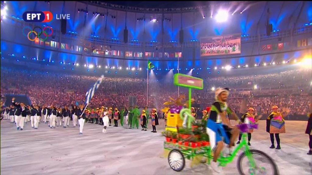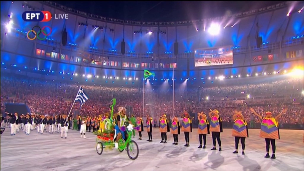 Η ελληνική ολυμπιακή αποστολή, που αποτελείται από 94 αθλητές, εισήλθε στο «Μαρκανά» με σημαιοφόρο τη Σοφία Μπεκατώρου και γνώρισε την αποθέωση από το κοινό.