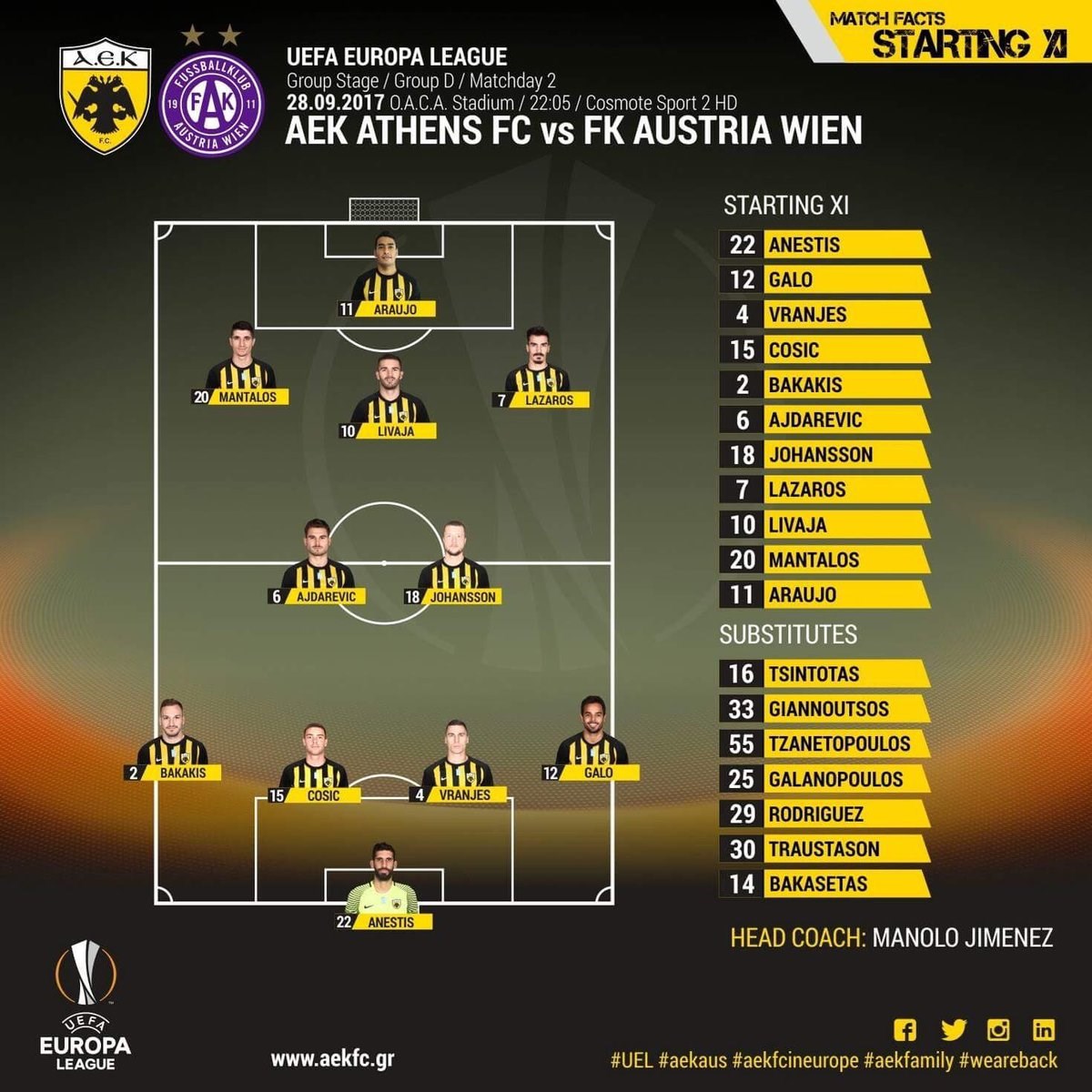 Με σύστημα 4-2-3-1 και τους Σέρχιο Αραούχο και Μάρκο Λιβάγια μαζί στην επίθεση παρατάσσει ο Μανόλο Χιμένεθ την ΑΕΚ στην αναμέτρηση με την Αούστρια Βιέννης για την 2η αγωνιστική του Europa League. Παράλληλα, ο Αστρίτ Αϊντάρεβιτς επιλέχθηκε για να πλαισιώσει τον Γιάκομπ Γιόχανσον στη μεσαία γραμμή.