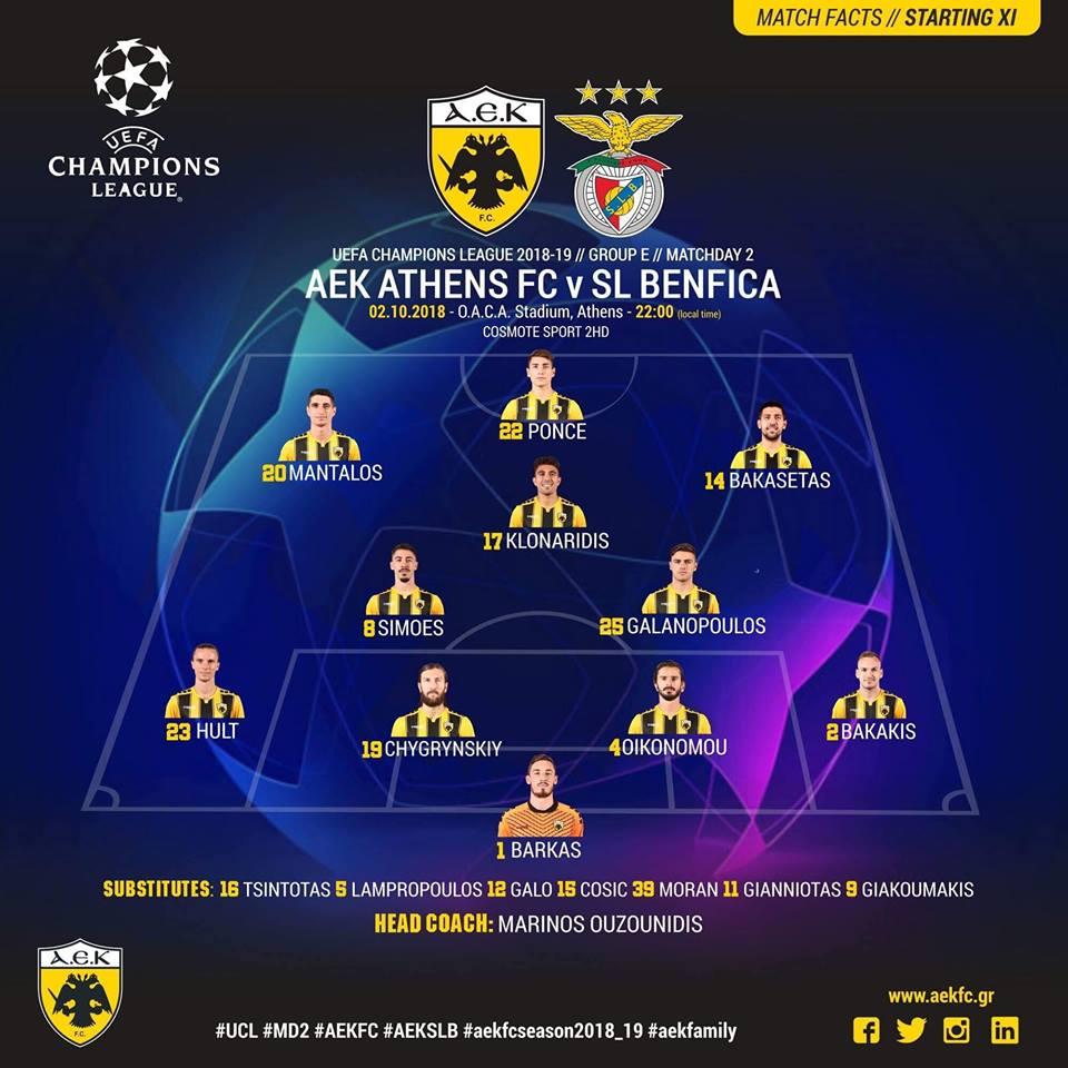 Έγινε γνωστή η ενδεκάδα της ΑΕΚ για τον αγώνα με την Μπενφίκα. Ο Μαρίνος Ουζουνίδης προτίμησε τελικά τον Τσιγκρίνσκι για παρτενέρ του Οικονόμου στο κέντρο της άμυνας, ενώ πίσω από τον Πόνσε θα παίξει ο Κλωναρίδης, δεξιά ο Μπακασέτας και αριστερά ο Μάνταλος.