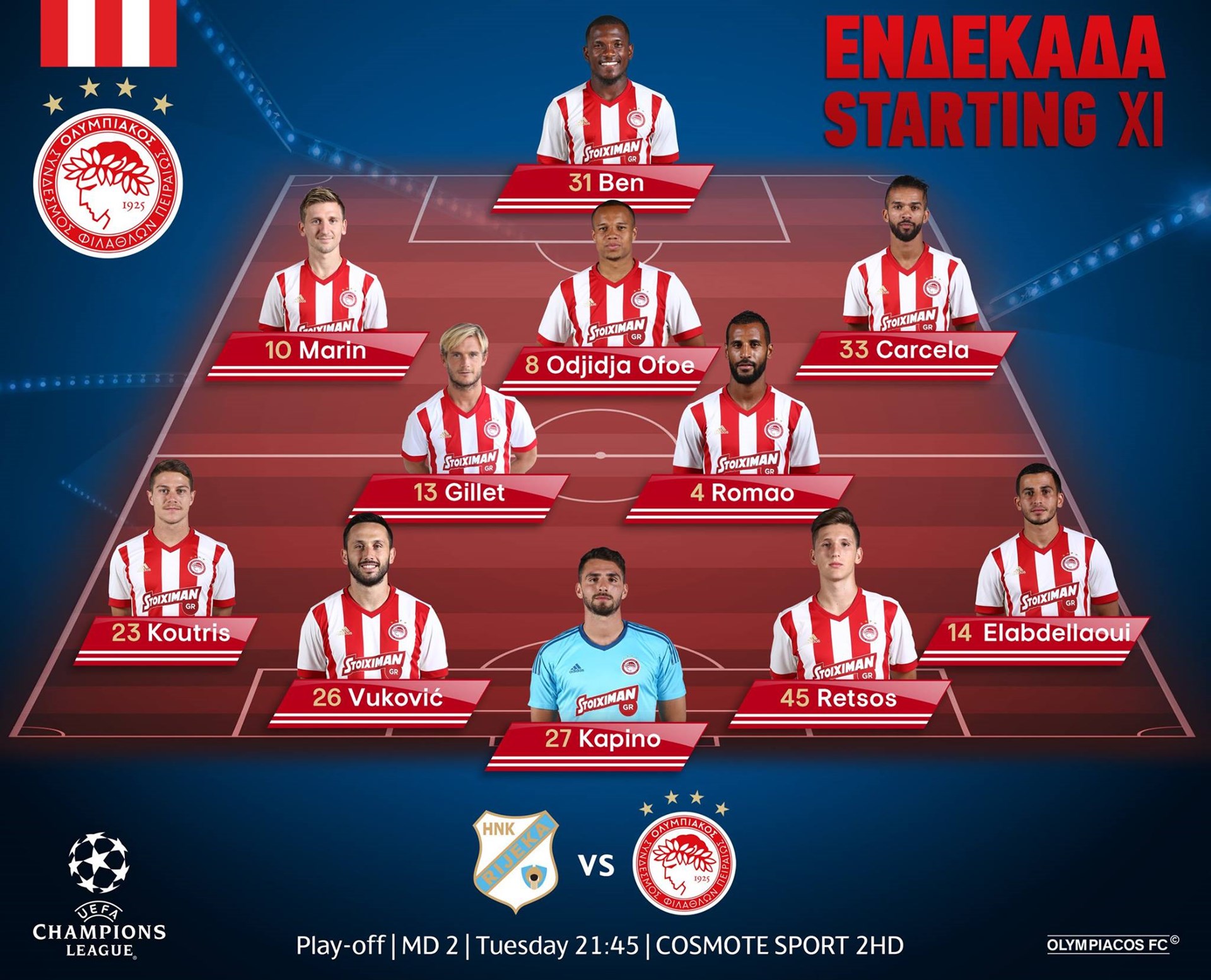 Πριν από λίγο έγινε γνωστή η ενδεκάδα με την οποία θα παραταχθεί ο Ολυμπιακός στον επαναληπτικό για τα πλέι οφ του Τσάμπιονς Λιγκ κόντρα στην Ριέκα. Συγκεκριμένα ο Μπέσνικ Χάσνι επέλεξε τους Καπίνο, Ομάρ, Ρέτσο, Βούκοβιτς, Κούτρη, Ρομαό, Ζιλέ, Μαρίν, Καρσελά, Οφόε και Μπεν.
