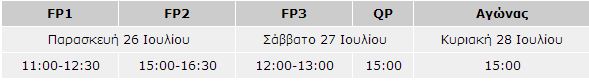 Στον παρακάτω πίνακα μπορείτε να δείτε το πρόγραμμα του 3ημέρου του GP Ουγγαρίας σε ώρες Ελλάδας.
