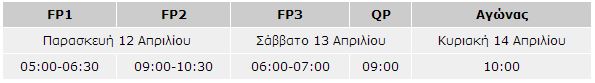 Στο GP Κίνας δεν αναμένεται να συμμετάσχει ο καιρός. Η πρόγνωση είναι ότι δεν θα υπάρξει βροχόπτωση καμία από τις 3 ημέρες του αγώνα. Ο αγώνας θα ξεκινήσει στις 10:00 το πρωί της Κυριακής 14/4.