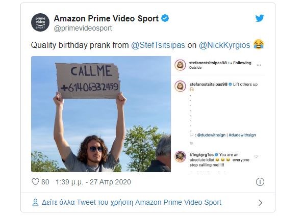 Το δώρο γενεθλίων που έκανε ο Στέφανος Τσιτσιπάς στον Νικ Κύργιο είναι βέβαιο ότι θα το θυμάται για πάντα ο Ελληνοαυστραλός τενίστας. Συγκεκριμένα ο Στέφανος δημοσίευσε στο Instagram το τηλέφωνο του Κύργιου, ο οποίος κλείνει σήμερα τα 25.