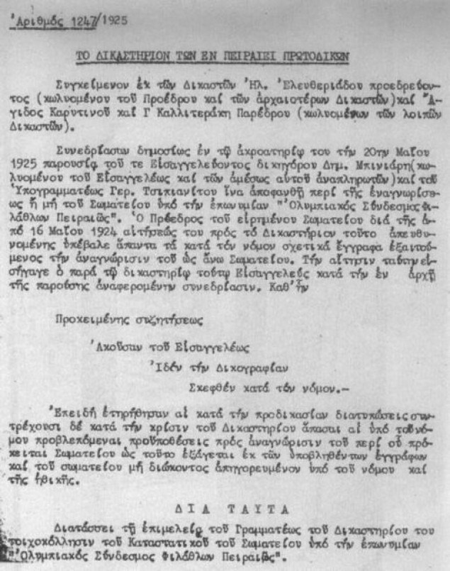 «Συνίσταται εν Πειραιεί υπό τον τίτλον “Ολυμπιακός Σύνδεσμος Φιλάθλων Πειραιώς” σωματείον, ούτινος σκοπός είναι η ανάπτυξις της σωματικής αγωγής παρά τη νεολαία και η κατά πάντα φίλαθλον τρόπον εξύψωσις αυτής» ανέγραφε το σχετικό καταστατικό και ο λαοφιλέστερος και πιο επιτυχημένος ελληνικός σύλλογος, είχε μόλις «γεννηθεί».