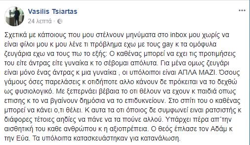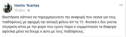 Υπενθυμίζουμε ότι ο Βασίλης Τσιάρτας σε προηγούμενες αναρτήσεις του στο Facebook είχε προκαλέσει αντιδράσεις σχετικά με το νομοσχέδιο για τις αλλαγές φύλου, σχολιάζοντας: