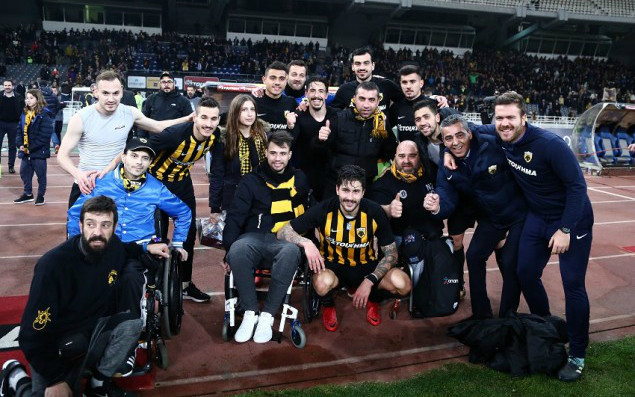 Οι παίκτες της Ένωσης, λοιπόν, πήγαν στα παιδιά με ειδικές ανάγκες και πανηγύρισαν μαζί τους την μεγάλη πρόκριση της ομάδας τους στην επόμενη φάση του κυπέλλου Ελλάδος.