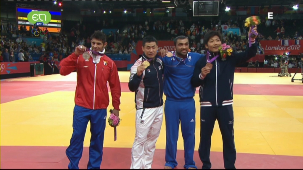 Ο Έλληνας πρωταθλητής στο τζούντο, Ηλίας Ηλιάδης, πανηγυρίζει την κατάκτηση του χάλκινου μεταλλίου, στους Ολυμπιακούς Αγώνες του Λονδίνου, κατά τη διάρκεια της απονομής.