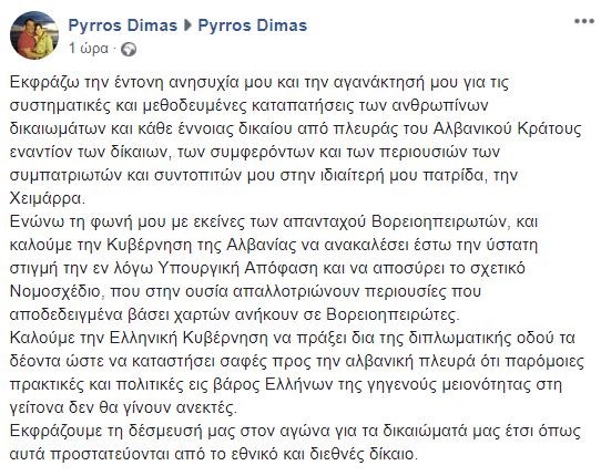Έκανε λόγο για συστηματικές και μεθοδευμένες καταπατήσεις των ανθρωπίνων δικαιωμάτων, ενώ κάλεσε την ελληνική κυβέρνηση να πράξει τα δέοντα.Αναλυτικά τα όσα έγραψε στο Facebook:”Εκφράζω την έντονη ανησυχία μου και την αγανάκτησή μου για τις συστηματικές και μεθοδευμένες καταπατήσεις των ανθρωπίνων δικαιωμάτων και κάθε έννοιας δικαίου από πλευράς του Αλβανικού Κράτους εναντίον των δίκαιων, των συμφερόντων και των περιουσιών των συμπατριωτών και συντοπιτών μου στην ιδιαίτερή μου πατρίδα, την Χειμάρρα.Ενώνω τη φωνή μου με εκείνες των απανταχού Βορειοηπειρωτών, και καλούμε την Κυβέρνηση της Αλβανίας να ανακαλέσει έστω την ύστατη στιγμή την εν λόγω Υπουργική Απόφαση και να αποσύρει το σχετικό Νομοσχέδιο, που στην ουσία απαλλοτριώνουν περιουσίες που αποδεδειγμένα βάσει χαρτών ανήκουν σε Βορειοηπειρώτες.Καλούμε την Ελληνική Κυβέρνηση να πράξει δια της διπλωματικής οδού τα δέοντα ώστε να καταστήσει σαφές προς την αλβανική πλευρά ότι παρόμοιες πρακτικές και πολιτικές εις βάρος Ελλήνων της γηγενούς μειονότητας στη γείτονα δεν θα γίνουν ανεκτές.Εκφράζουμε τη δέσμευσή μας στον αγώνα για τα δικαιώματά μας έτσι όπως αυτά προστατεύονται από το εθνικό και διεθνές δίκαιο”.