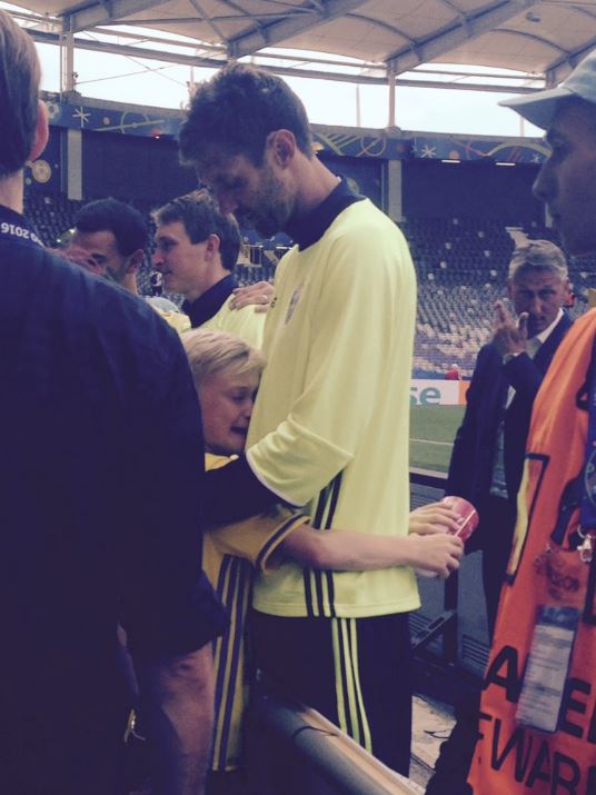 Τη συγκινητική στιγμή που ο τερματοφύλακας της Εθνικής ομάδας της Σουηδίας Αντρέας Ίσακσον παρηγορεί τον μικρό του γιο ο οποίος κλαίει με λυγμούς μετά την ήττα από την Ιταλία κατέγραψε ο φωτογραφικός φακός.