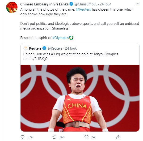 Κινέζοι διπλωμάτες κατηγόρησαν το Reuters για άσχημη συμπεριφορά επειδή χρησιμοποιήθηκε “ακατάλληλη” φωτογραφία σε μια αναφορά σχετικά με τη χρυσή Ολυμπιονίκη της χώρας, Zhihui Hou. «Μεταξύ όλων των φωτογραφιών από τον αγώνα, το @Reuters επέλεξε αυτή, που δείχνει μόνο πόσο άσχημοι είναι», έγραψε το Σάββατο η κινεζική πρεσβεία της Σρι Λάνκα.
