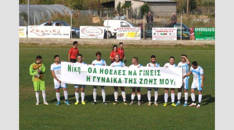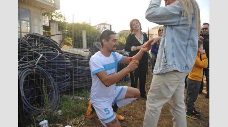 Ο έμπειρος αμυντικός, ο οποίος αγωνίζεται στον Δαμασιακό, ομάδα που συμμετέχει στην Α΄ κατηγορία της ΕΠΣ Λάρισας, πριν από τη σέντρα του αγώνα με τον Αμπελωνιακό για την 5η αγωνιστική αποφάσισε να κάνει πρόταση γάμου στην εκλεκτή της καρδιάς του, Νίκη, με έναν πρωτότυπο τρόπο.