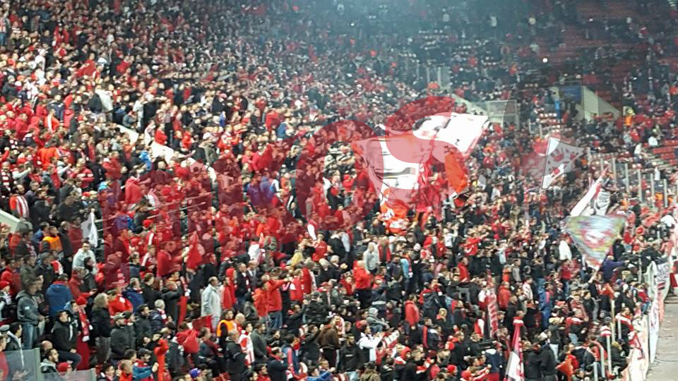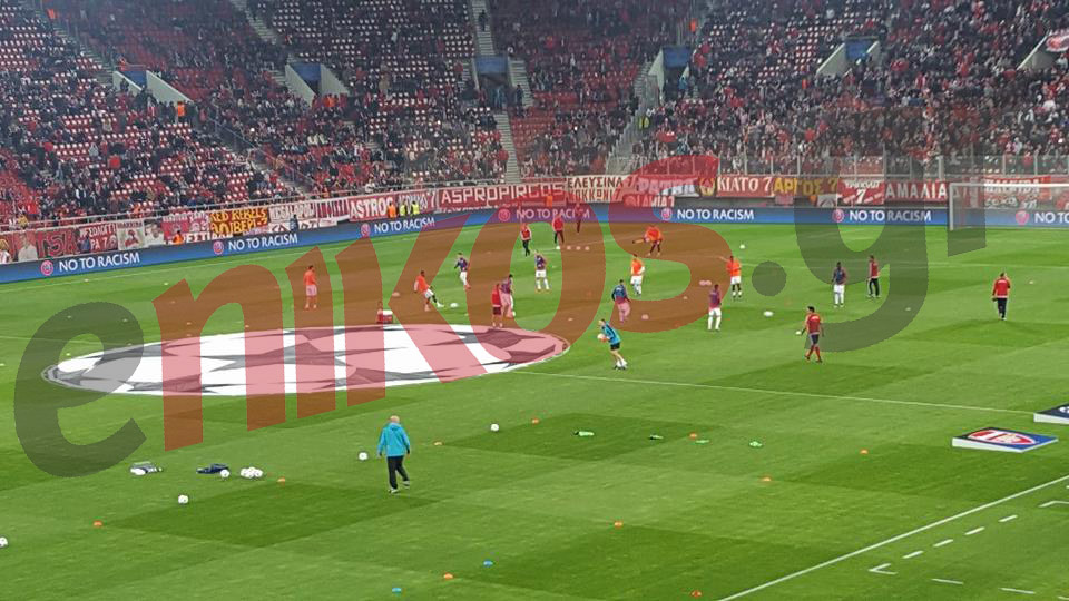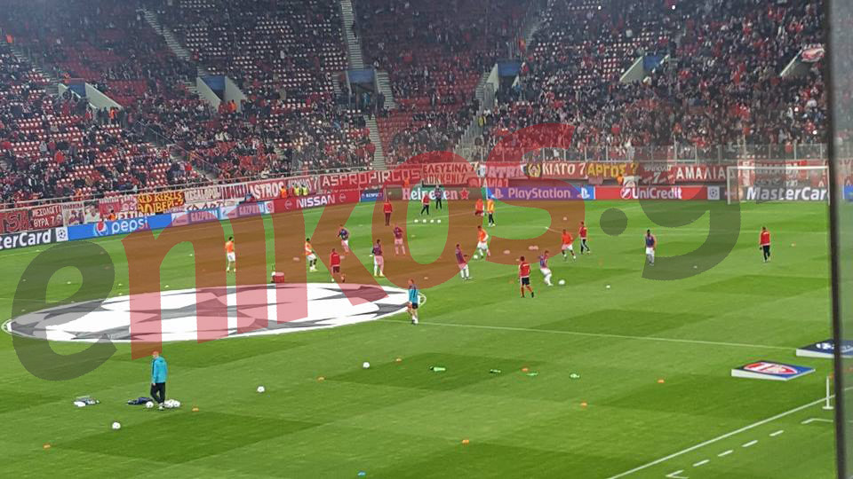 Οι παίκτες του Ολυμπιακού βγήκαν για προθέρμανση στο “Καραϊσκάκης”, με τους οπαδούς να τραγουδούν συνθήματα προκειμένου να τους εμψυχώσουν ενόψει του αγώνα με την Άρσεναλ.