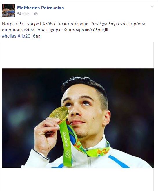 Tη χαρά του με τους διαδικτυακούς του φίλους στο Facebook θέλησε να μοιραστεί ο χρυσός Ολυμπιονίκης, Λευτέρης Πετρούνιας, μετά την τεράστια επιτυχία που σημείωσε στους κρίκους.