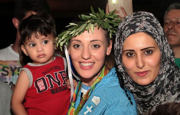Ανάμεσά τους και πρόσφυγες – άνδρες, γυναίκες και παιδιά – από τη Συρία που έχουν καταλύσει στην Δράμα, οι οποίοι ζήτησαν από την Ελληνίδα Ολυμπιονίκη να φωτογραφηθούν μαζί της.