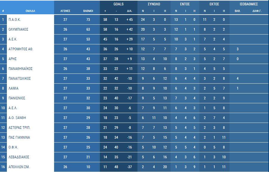 Η βαθμολογία της Σούπερ Λιγκ – Δύο βαθμοί χωρίζουν τον ΠΑΟΚ από τον τίτλο