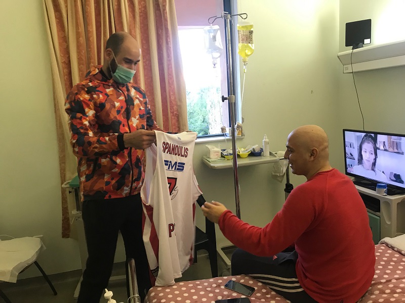 Ο V-Span του χάρισε μια φανέλα του, μια προπονητική μπλούζα και μια μπάλα με την υπογραφή όλων των παικτών της ομάδας. Από την πλευρά του, ο Αντώνης Λουκαδής -ο οποίος παρακολουθεί ανελλιπώς από την τηλεόραση όλα τα ματς των «ερυθρολεύκων»-, υποσχέθηκε στον αρχηγό πως στην αναμέτρηση με την Αναντολού Εφές θα βρίσκεται στο ΣΕΦ για να παρακολουθήσει δίπλα από τον πάγκο τον αγώνα και να στηρίξει τους “ερυθρόλευκους”.