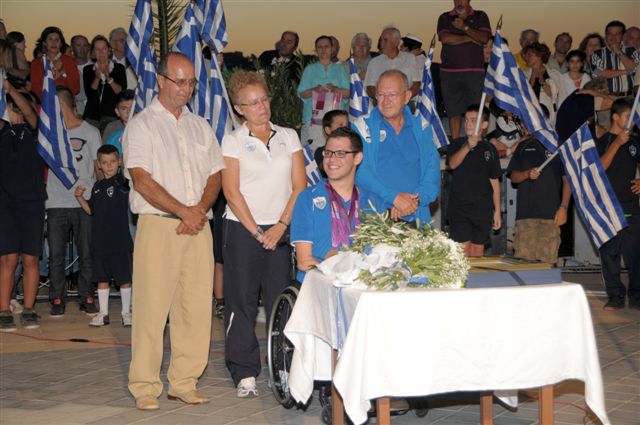 Στη σύντομη ομιλία του ο Δήμαρχος Πέτρος Φιλίππου, φανερά συγκινημένος, μίλησε με θερμά λόγια για τον Έλληνα Παραολυμπιονίκη, λέγοντας μεταξύ άλλων: «Υποδεχόμαστε το σημαιοφόρο της Ελληνικής Παραολυμπιακής Αποστολής, υποδεχόμαστε το σημαιοφόρο της Ελλάδας, υποδεχόμαστε το σημαιοφόρο του δήμου μας, αλλά πάνω απ’ όλα υποδεχόμαστε το σημαιοφόρο στις καρδιές μας. Τελικά σε αυτήν τη χώρα υπάρχουν ακόμα άνθρωποι που μπορούν να μας προσφέρουν χαμόγελο, συγκίνηση, αισιοδοξία και ελπίδα. Ένας τέτοιος άνθρωπος είναι ο Άρης Μακροδημήτρης».