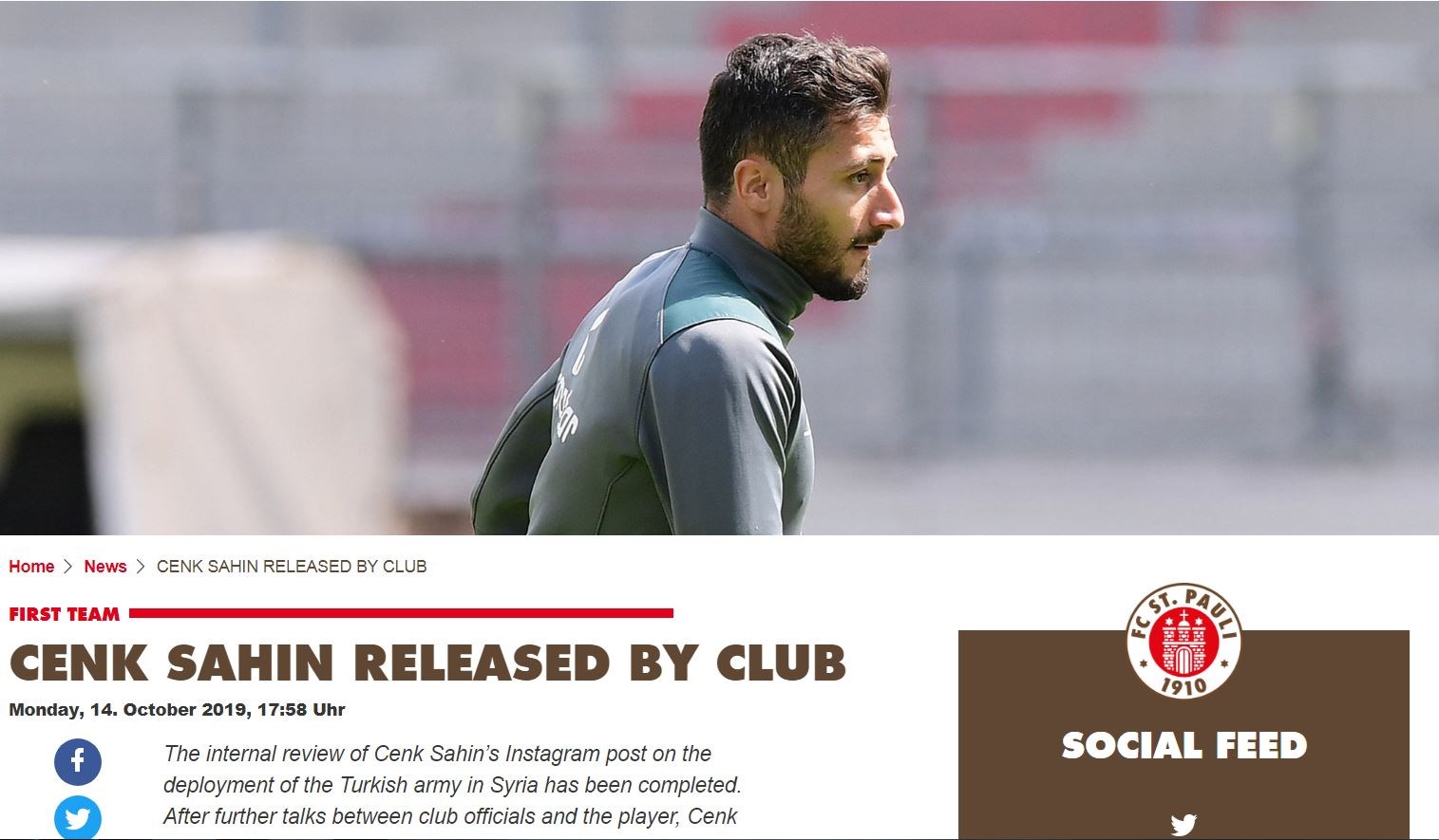 Η Ζανκτ Πάουλι, ομάδα δεύτερης κατηγορίας της Γερμανίας, ανακοίνωσε την αποδέσμευση του Τούρκου ποδοσφαιριστή Τσενκ Σαχίν, ο οποίος πριν από λίγες ημέρες με ανάρτησή του στο διαδίκτυο υποστήριξε την στρατιωτική επιχείρηση της Τουρκίας στη βόρεια Συρία.