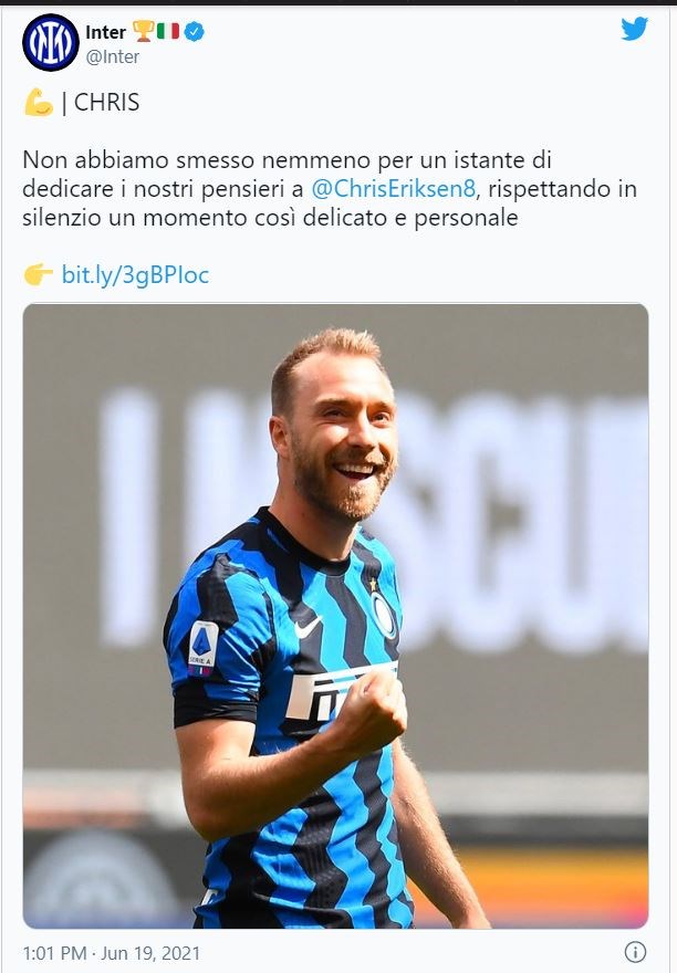 Mήνυμα αγάπης της Ίντερ στον 29χρονο Δανό διεθνή μέσο, Κρίστιαν Έρικσεν, που αναδείχθηκε πρωταθλητής Ιταλίας την τελευταία σεζόν, φορώντας τη φανέλα της. Η ιταλική ομάδα επανεξετάζει τις επτά ημέρες γεμάτες αβεβαιότητα, φόβο, που ευτυχώς απομακρύνονται καθώς υπάρχει θετική εξέλιξη στην υγεία του.