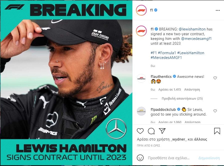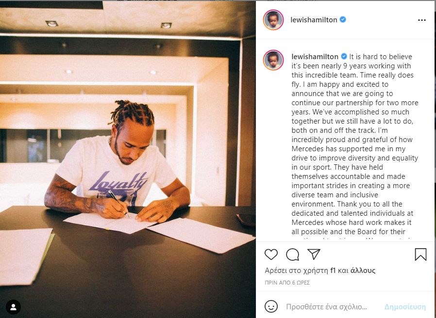 Η ανακοίνωση της Mercedes: «Η Mercedes-AMG Petronas F1 Team είναι στην ευχάριστη θέση να ανακοινώσει μια διετή επέκταση της συνεργασίας της με τον επτά φορές παγκόσμιο πρωταθλητή Λιούις Χάμιλτον, για να συνεχίσει μια σχέση που έχει γίνει η πιο επιτυχημένη μεταξύ ενός οδηγού και μιας ομάδας στην ιστορία της F1. Ο Λιούις θα είναι οδηγός της Mercedes το 2022 και το 2023».