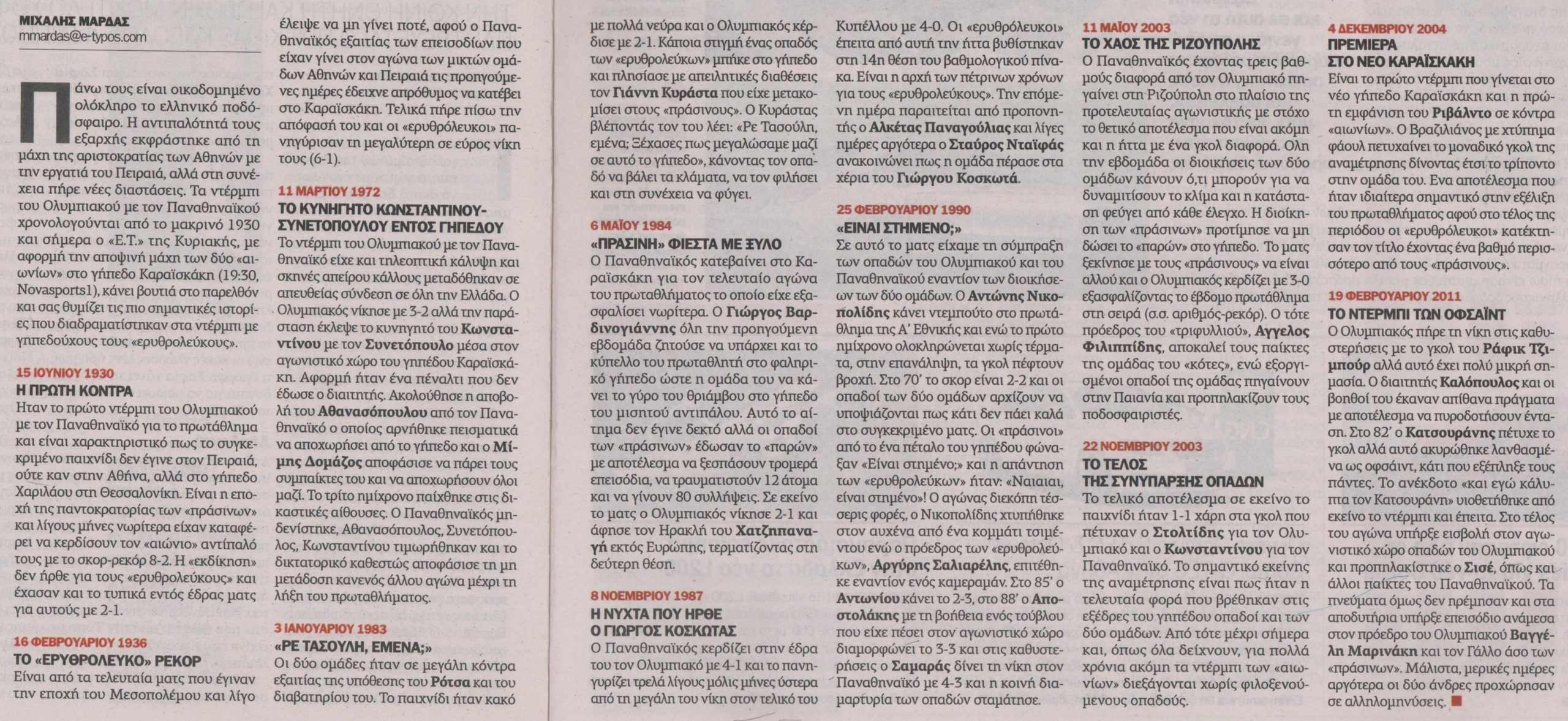 Τα ντέρμπι του Ολυμπιακού με τον Παναθηναϊκό χρονολογούνται από το μακρινό 1930. Με αφορμή την αποψινή μάχη των δύο αιωνίων στο γήπεδο Καραϊσκάκη, δείτε τις πιο σημαντικές ιστορίες που διαδραματίστηκαν στα ντέρμπι με γηπεδούχους του ερυθρόλευκους, από τον Ελεύθερο Τύπο: