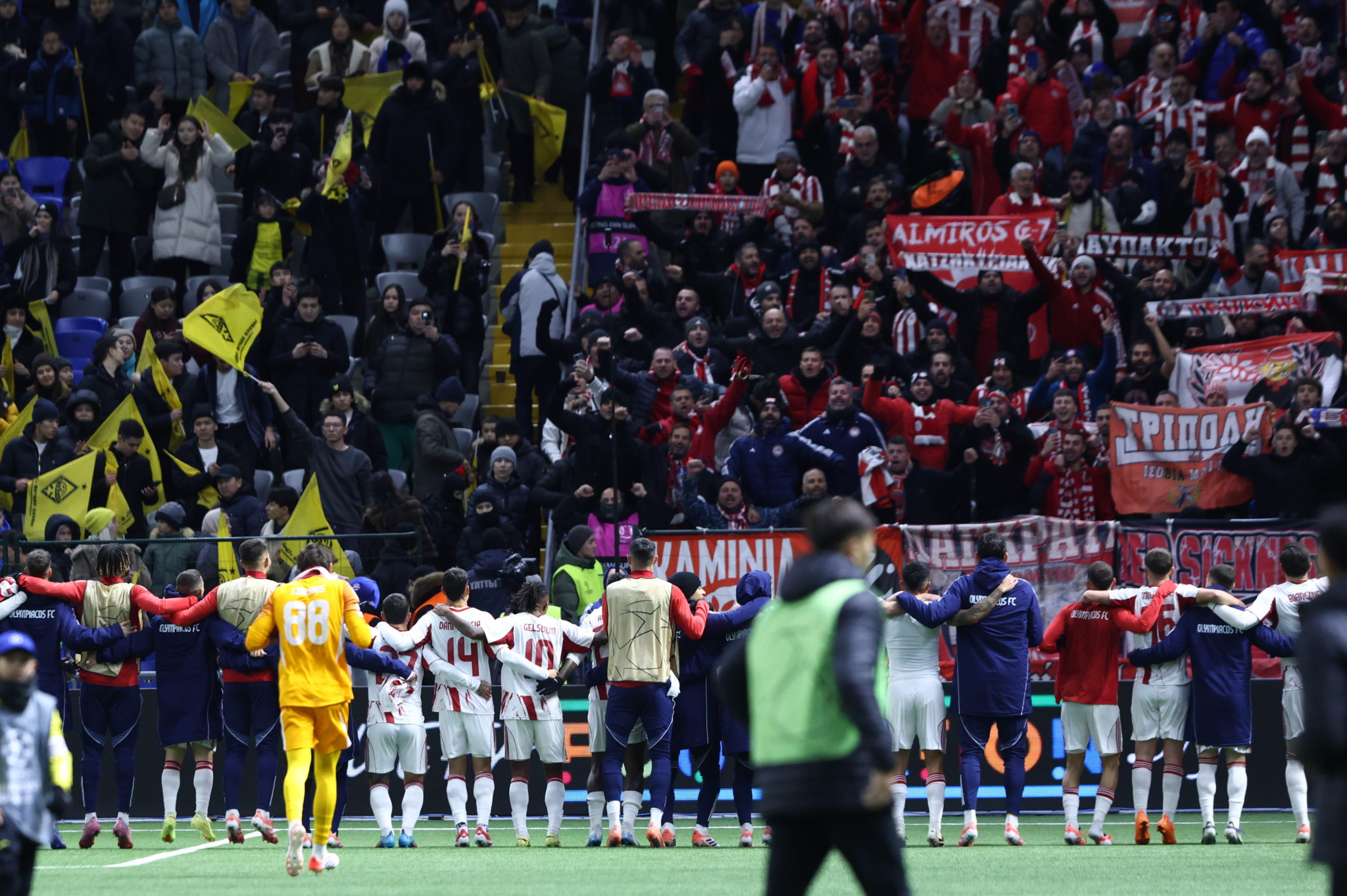 Με το τελευταίο σφύριγμα, οι παίκτες του Ολυμπιακού ξέσπασαν σε πανηγυρισμούς για το μεγάλο «διπλό», ενώ οι περίπου 600 φίλοι της ομάδας που ταξίδεψαν ως το Καζακστάν έστησαν το δικό τους γιορτινό σκηνικό στην εξέδρα.