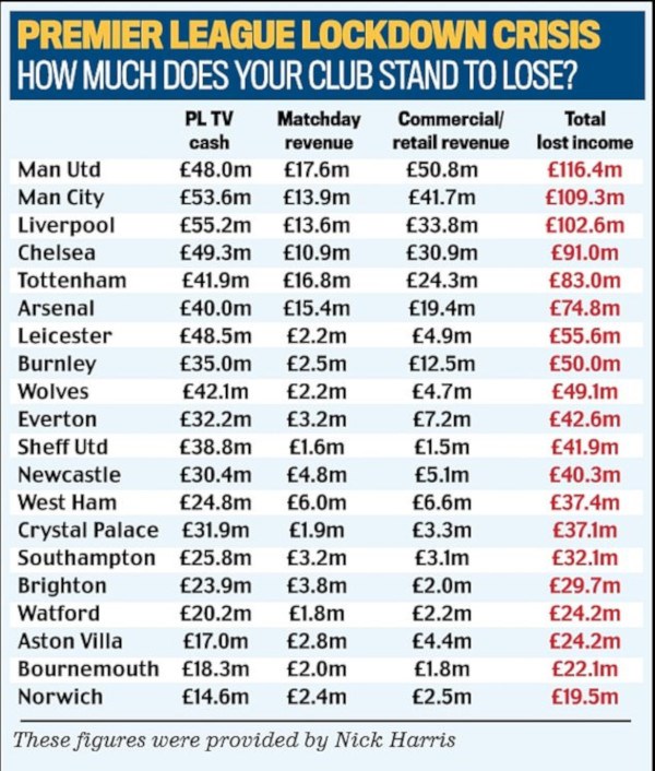 Την περασμένη Κυριακή, όμως, υπήρξε νέα έρευνα που έκανε τον ποδοσφαιρικό κόσμο να «παγώσει» ακόμη περισσότερο. Συγκεκριμένα, η ανάλυση της PricewaterhouseCoopers (PwC) δείχνει πως η πρώτη πρόβλεψη έπεσε έξω κατά πολύ, με τις ομάδες να κινδυνεύουν να χάσουν τουλάχιστον έξι δισεκατομμύρια ευρώ σε κέρδη.