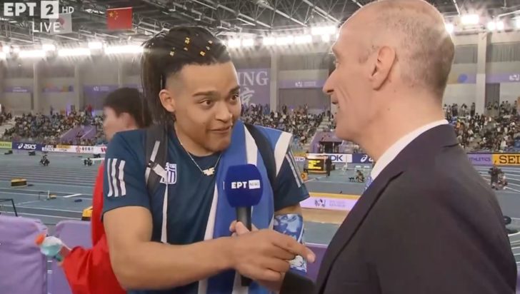 Ο αθλητής, χαλαρός πια μετά την σπουδαία εμφάνισή του, αστειεύτηκε με τον δημοσιογράφο της ΕΡΤ, που πήρε τις πρώτες δηλώσεις του.