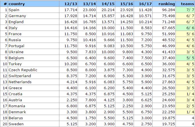 Η UEFA αναμένεται, από τη σεζόν 2018-2019, να δώσει τέσσερα απευθείας εισιτήρια στους ομίλους του Τσάμπιονς Λιγκ στις ομάδες των πρώτων τεσσάρων χωρών, δύο εισιτήρια στις χώρες 5-6 και από ένα στις χώρες 7-10.