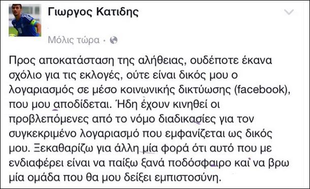 «Προς αποκατάσταση της αλήθειας, ουδέποτε έκανα σχόλια για τις εκλογές, ούτε είναι δικός μου ο λογαριασμός σε μέσω κοινωνικής δικτύωσης (facebook), που μου αποδίδεται. Ήδη έχουν κινηθεί οι προβλεπόμενες από το νόμο διαδικασίες για τον συγκεκριμένο λογαριασμό που εμφανίζεται ως δικός μου. Ξεκαθαρίζω για άλλη μία φορά ότι αυτό που με ενδιαφέρει είναι να παίξω ξανά ποδόσφαιρο και να βρω μία ομάδα που θα μου δείξει εμπιστοσύνη».