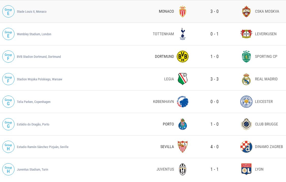 Στον όμιλο της Γιουβέντους σημειώθηκε μεγάλη έκπληξη αφού οι μπιανκονέρι δεν κατάφεραν να κερδίσουν την Λυών μένοντας στο 1-1, ενώ η Σεβίλλη διέσυρε την Ντιναμό Ζάγκρεμπ με 4-0.