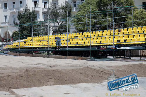 Τα φορτηγά έφεραν άμμο και τα συνεργεία του δήμου έστησαν την εξέδρα και το φιλέ. Με αυτόν τον τρόπο η πλατεία Αριστοτέλους στη Θεσσαλονίκη, μετατράπηκε σε ένα τεράστιο γήπεδο που θα φιλοξενήσει από την Παρασκευή το τουρνουά Beach voley, Grand Slam.Το θέαμα που θα προσφέρουν οι κορυφαίοι αθλητές που θα πάρουν μέρος, αναμένεται να είναι υψηλών προδιαγραφών.