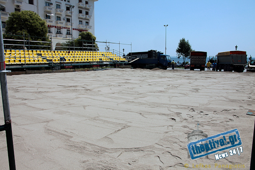 Τα φορτηγά έφεραν άμμο και τα συνεργεία του δήμου έστησαν την εξέδρα και το φιλέ. Με αυτόν τον τρόπο η πλατεία Αριστοτέλους στη Θεσσαλονίκη, μετατράπηκε σε ένα τεράστιο γήπεδο που θα φιλοξενήσει από την Παρασκευή το τουρνουά Beach voley, Grand Slam.Το θέαμα που θα προσφέρουν οι κορυφαίοι αθλητές που θα πάρουν μέρος, αναμένεται να είναι υψηλών προδιαγραφών.