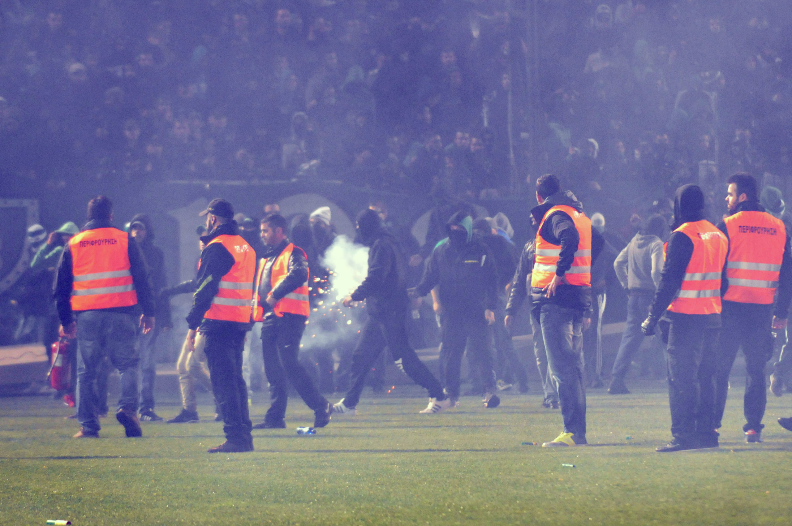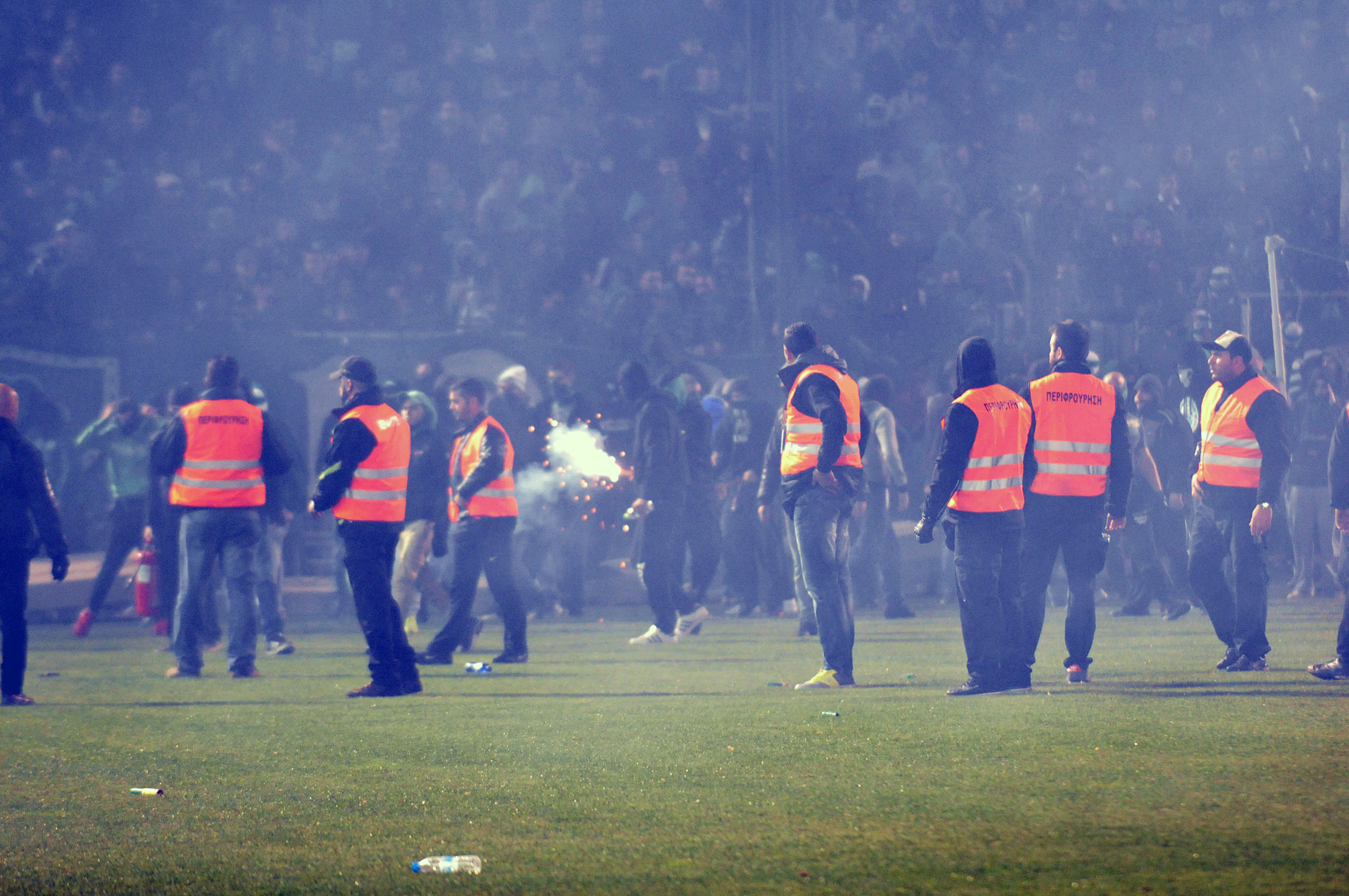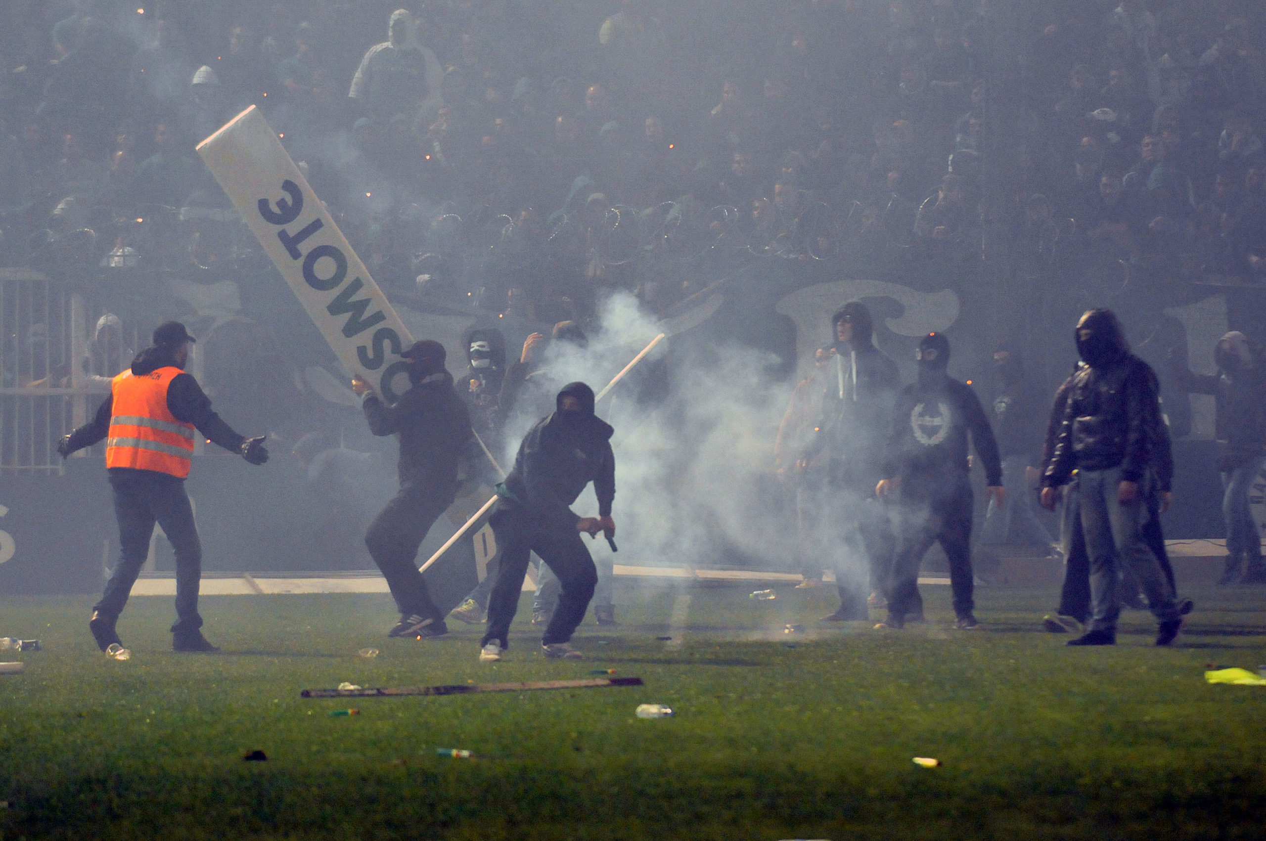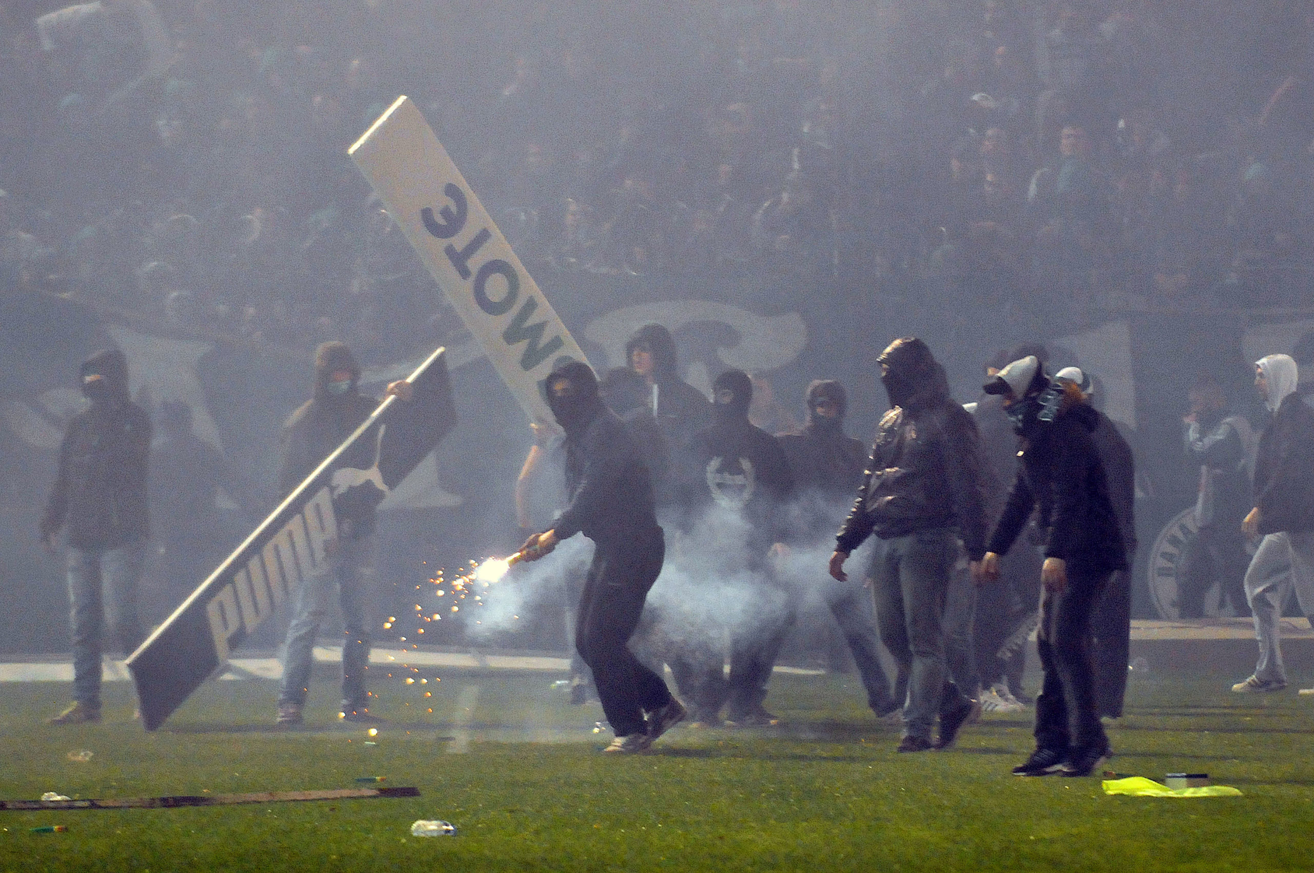 Αμέσως μετά οι κουκουλοφόροι άρχισαν να εκτοξεύουν φωτοβολίδες προς την πλευρά των αστυνομικών, ενώ το μένος των οπαδών στράφηκε και προς τα δημοσιογραφικά θεωρεία.
