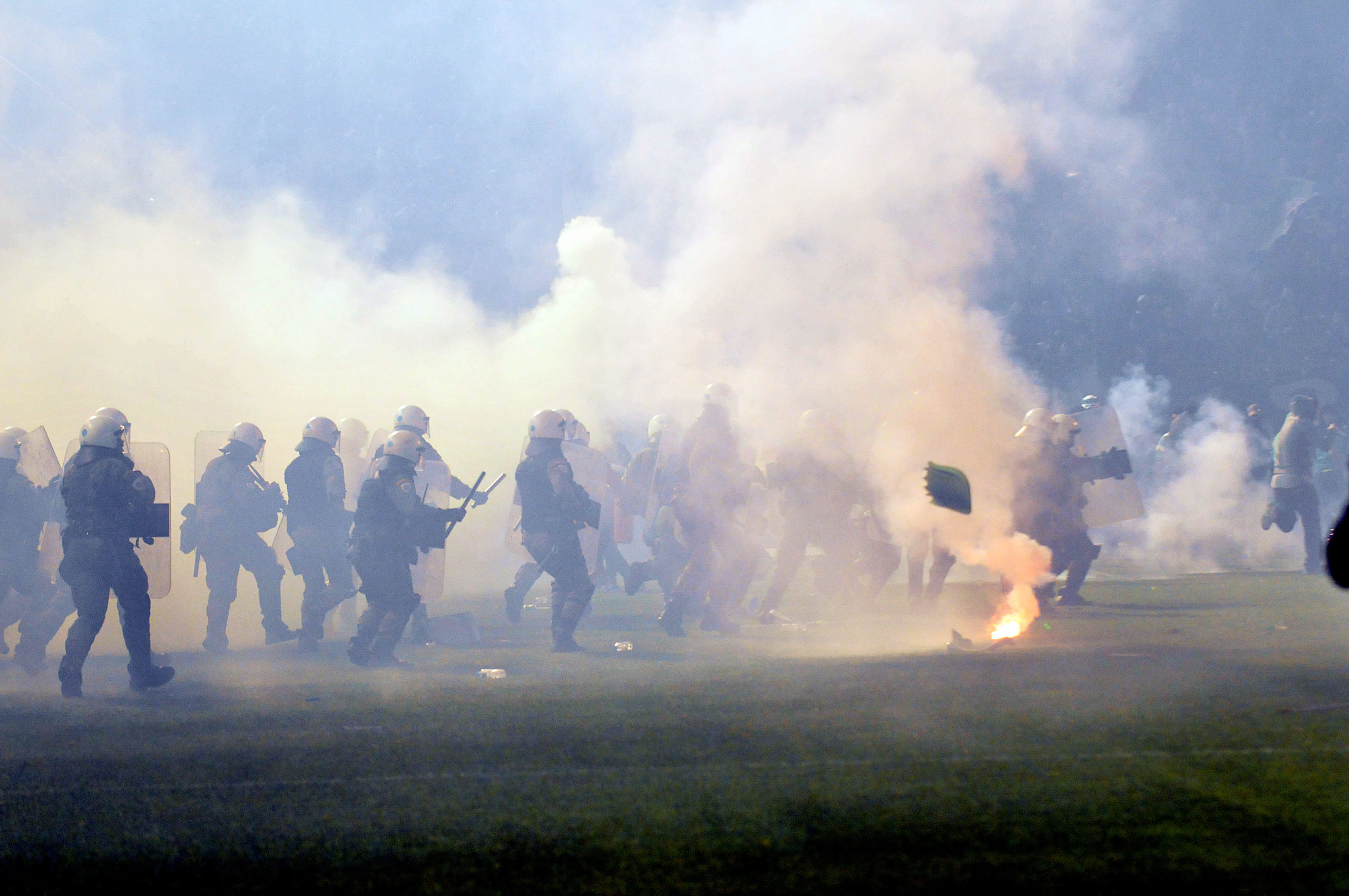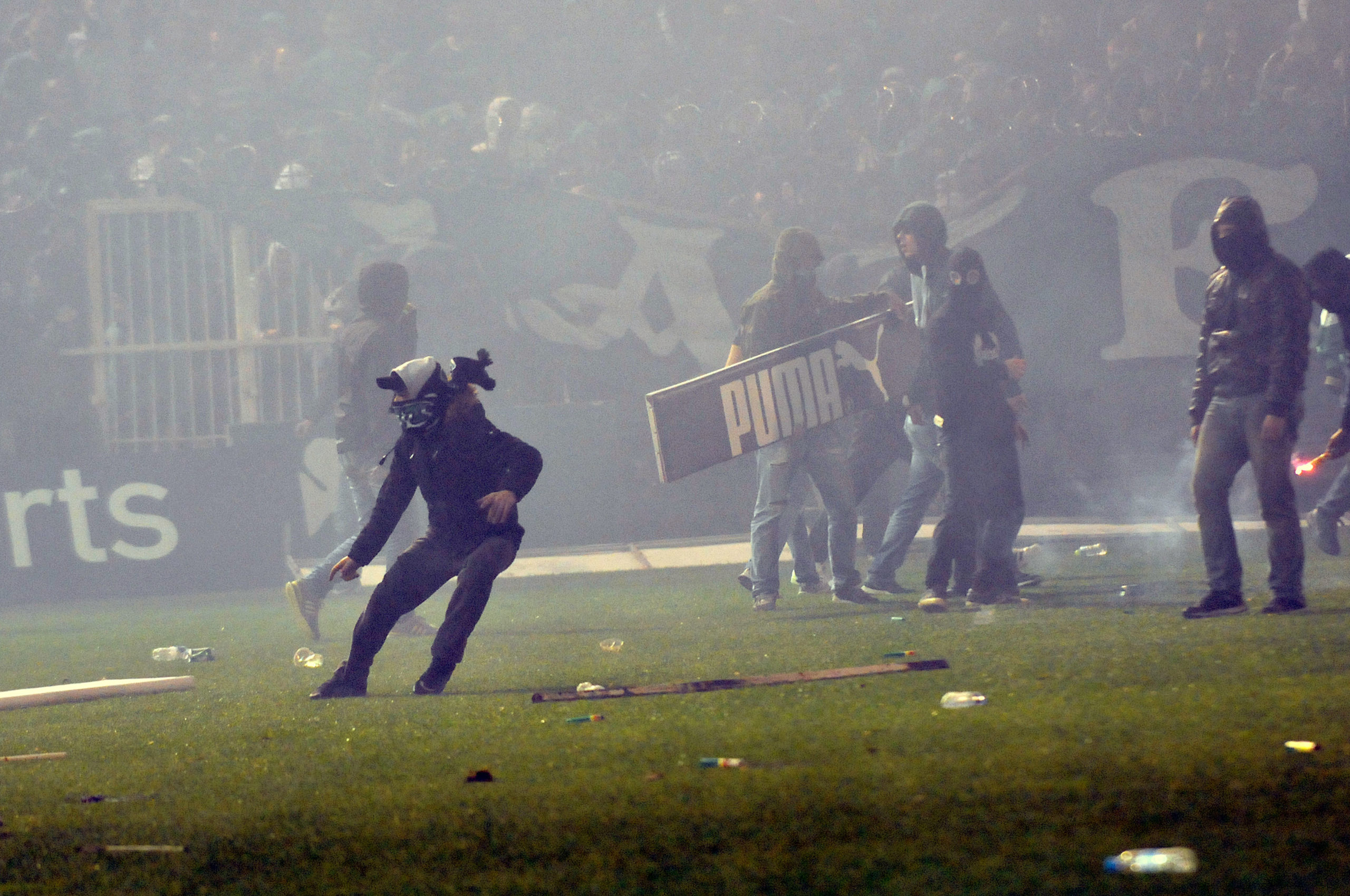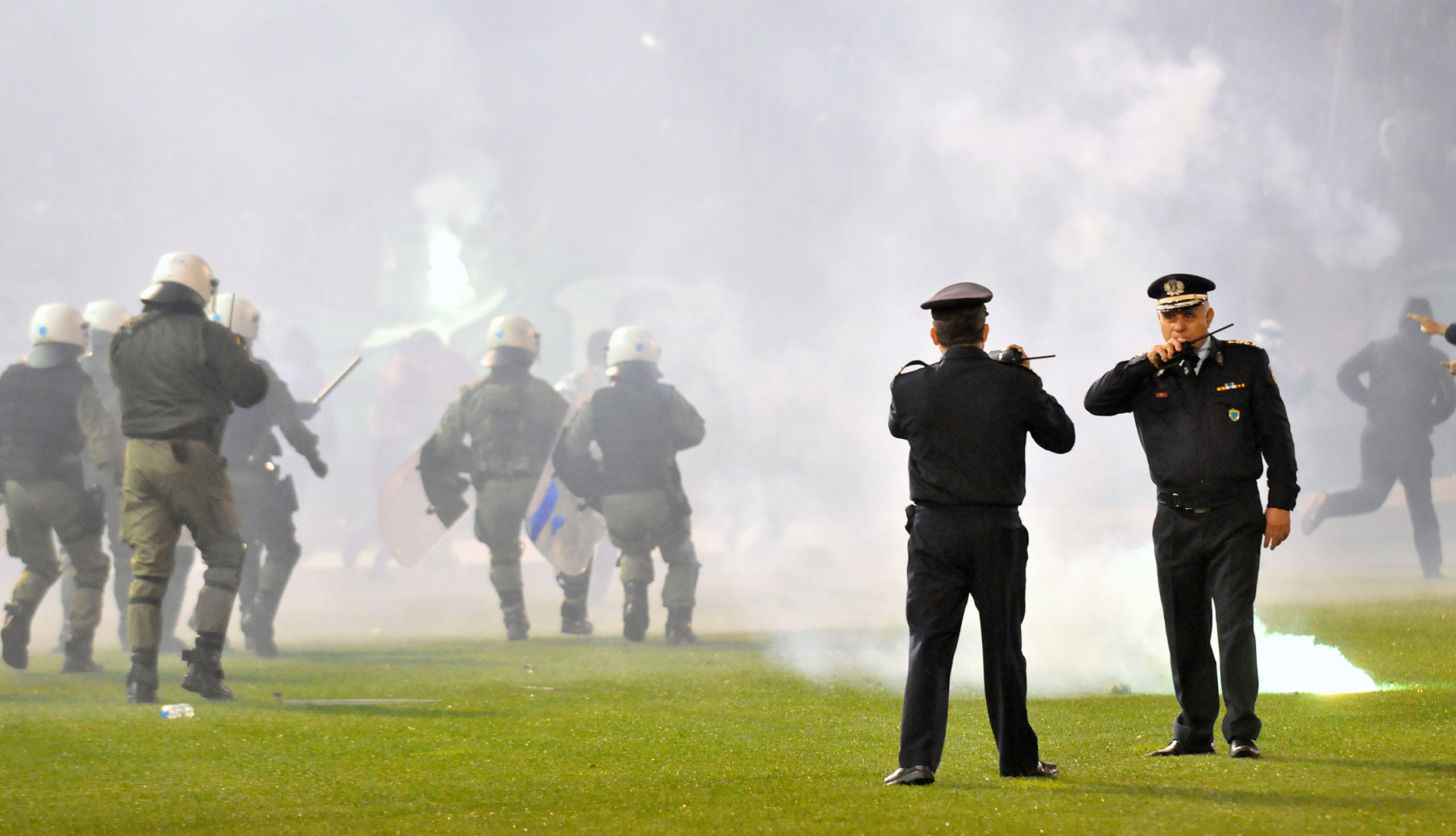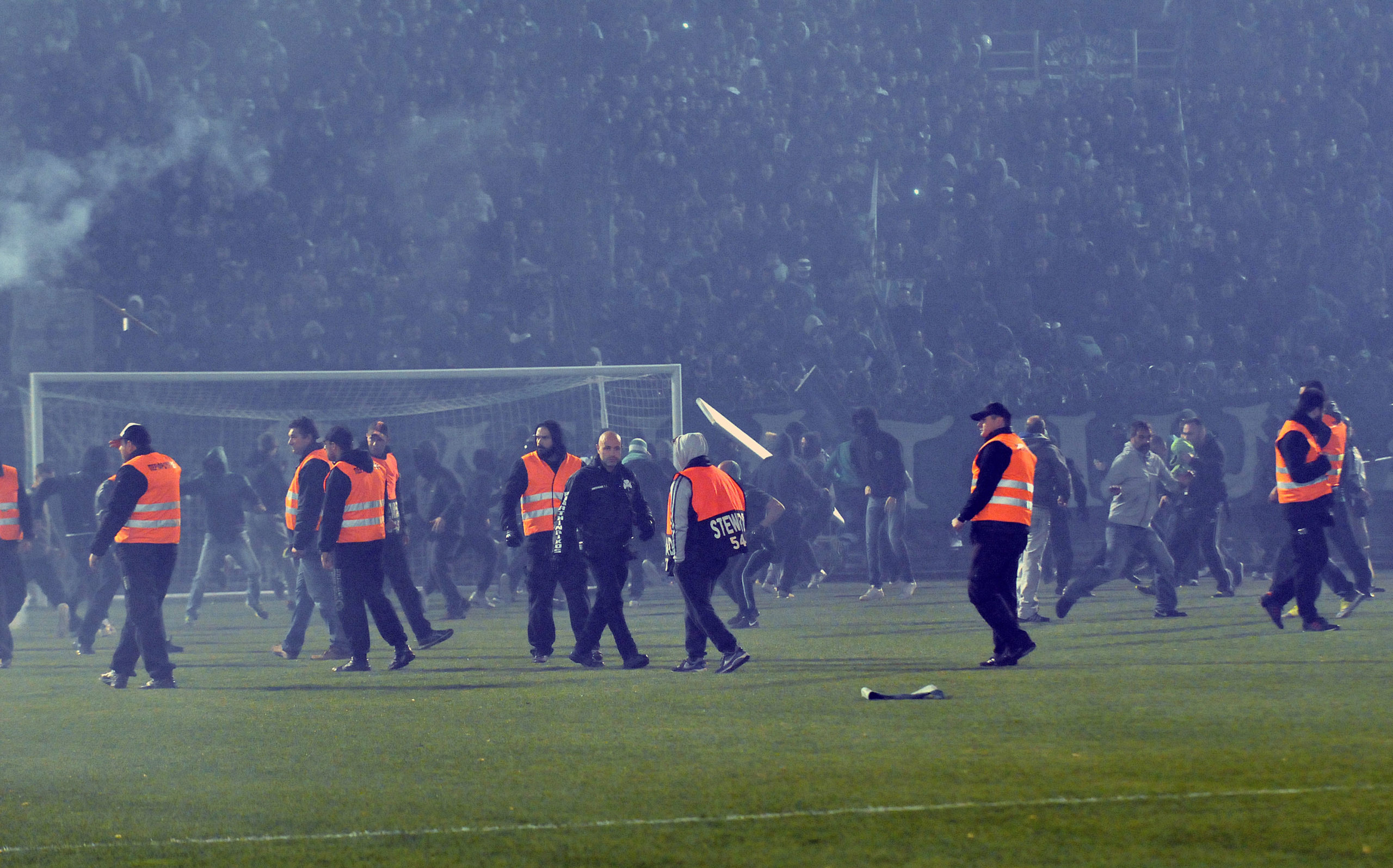 Αμέσως μετά οι κουκουλοφόροι άρχισαν να εκτοξεύουν φωτοβολίδες προς την πλευρά των αστυνομικών, ενώ το μένος των οπαδών στράφηκε και προς τα δημοσιογραφικά θεωρεία.