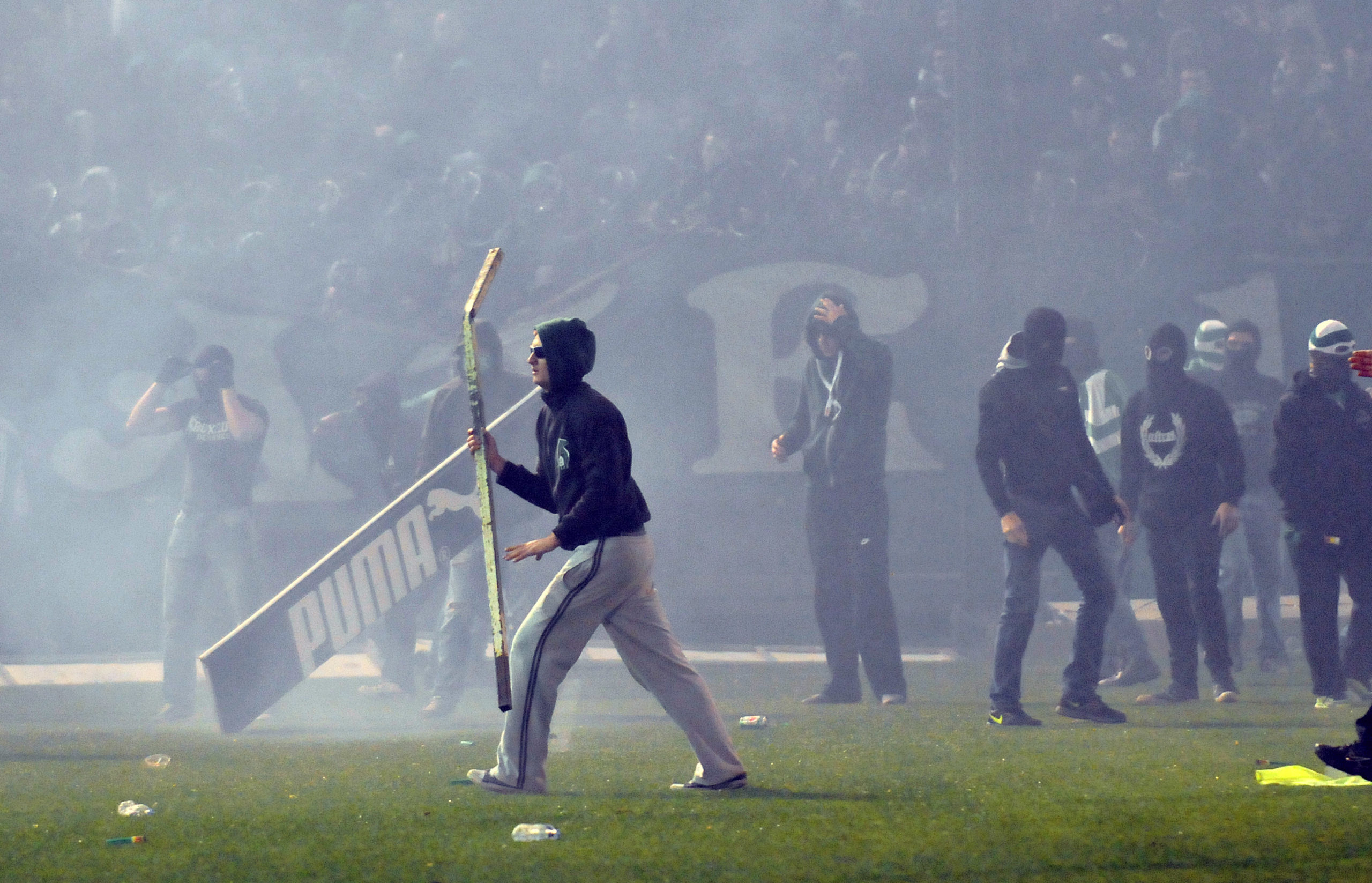 Σε πεδίο μάχης μετατράπηκε η Λεωφόρος Αλεξάνδρας, μόλις έγινε γνωστό ότι το ντέρμπι δεν θα διεξαχθεί. Δύο-τρία άτομα με κουκούλες παραβίασαν την πόρτα στην θύρα 13 και μπήκαν στο γήπεδο. Ο ένας κρατώντας ένα καπνογόνο κατευθύνθηκε προς την φυσούνα και το πέταξε προς τα ΜΑΤ χωρίς να τραυματιστεί κανείς.